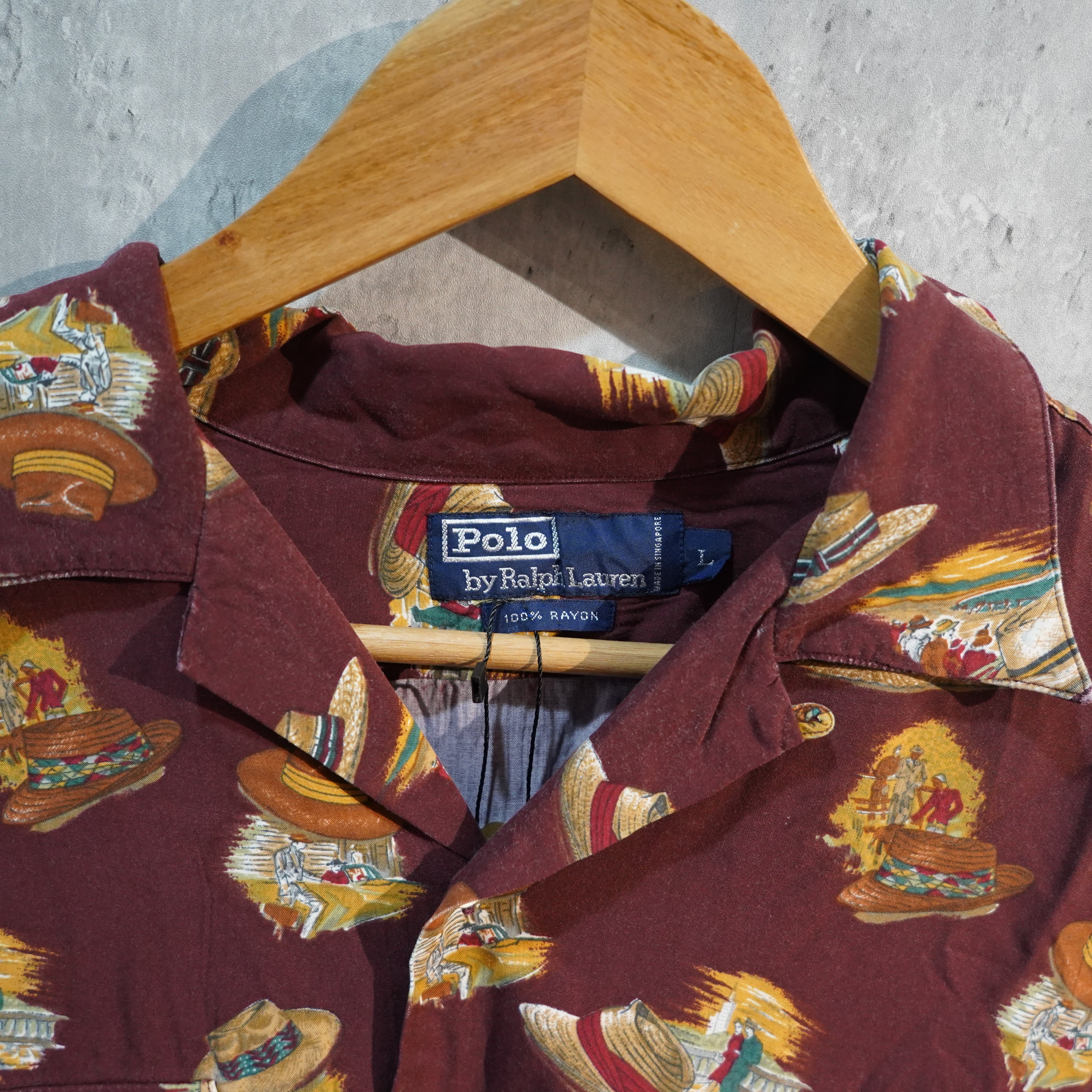 Polo Ralph Lauren ラルフローレン 開襟 オープンカラー 半袖シャツ Lサイズ 麦わら帽子 総柄 レーヨン100